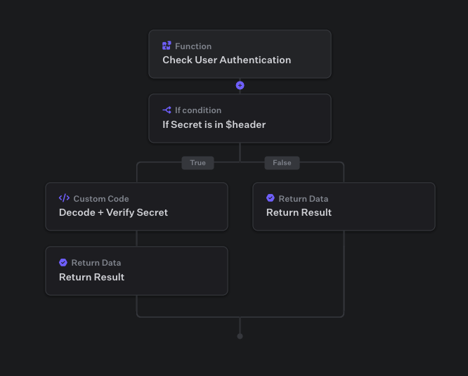 In the following example, we have many API Routes that all need the same custom header-based authentication. So, we create a function first to check if the required{{$header.secret}} is present and, if so, to decode and verify the value based on our custom authentication logic.