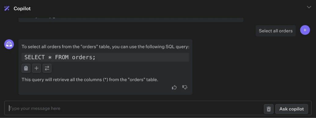 The SQL editor includes a SQL Copilot which will assist you in creating your desired SQL statements: