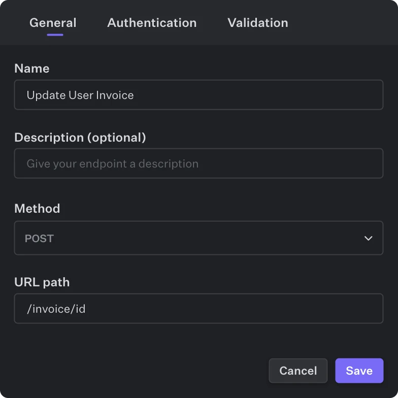 Select APIs in the left sidebar and click the Add route button.From here, you can specify the HTTP method and choose from GET, Create (POST), Update (PATCH) or DELETE.Each API starts with the , which lets you specify the settings and modifications of the specific endpoint you are about to create.Besides name and URL path, you can specify Authentication and Body Validation for this endpoint: