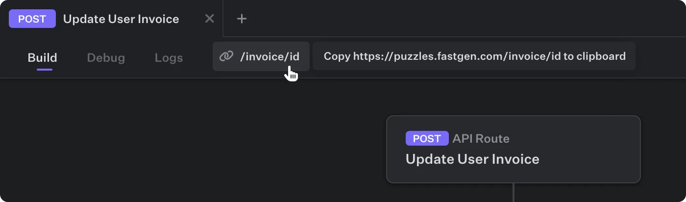 Deploy your routes with one click at the bottom right corner. The API will instantly be live and hosted by us. You can find and copy paste the URL at the top of the route: