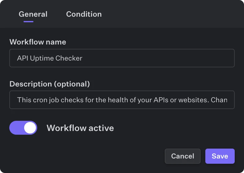 The lets you specify a name and description. The toggle lets you activate and deactivate the workflow. If a workflow is not toggled as active, it won’t execute.
